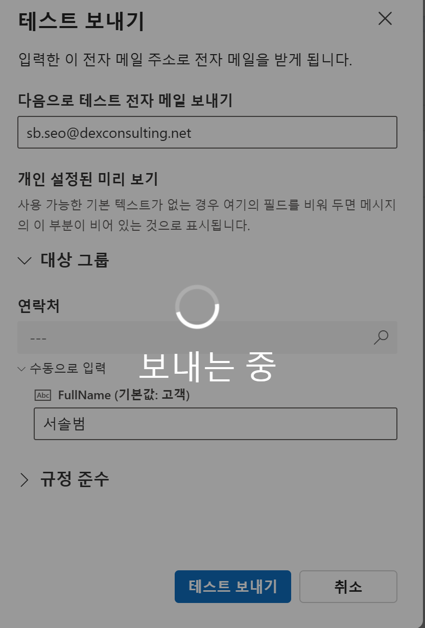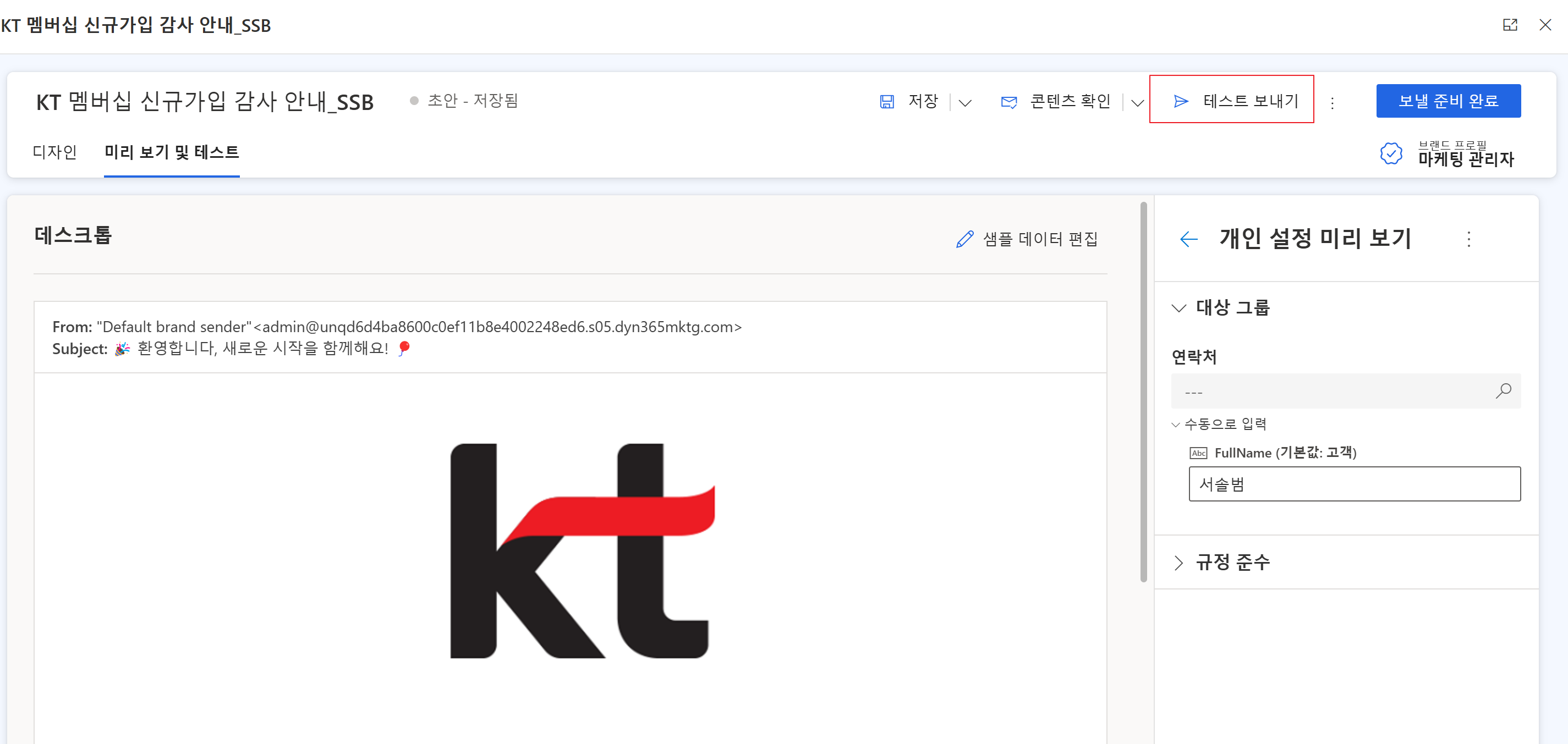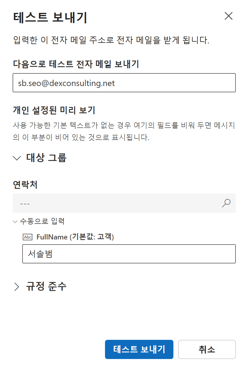 - 테스트를 보낼 이메일 주소와 개인화 변수에 삽입할 이름을 기입하고 [테스트 보내기]를 선택합니다.