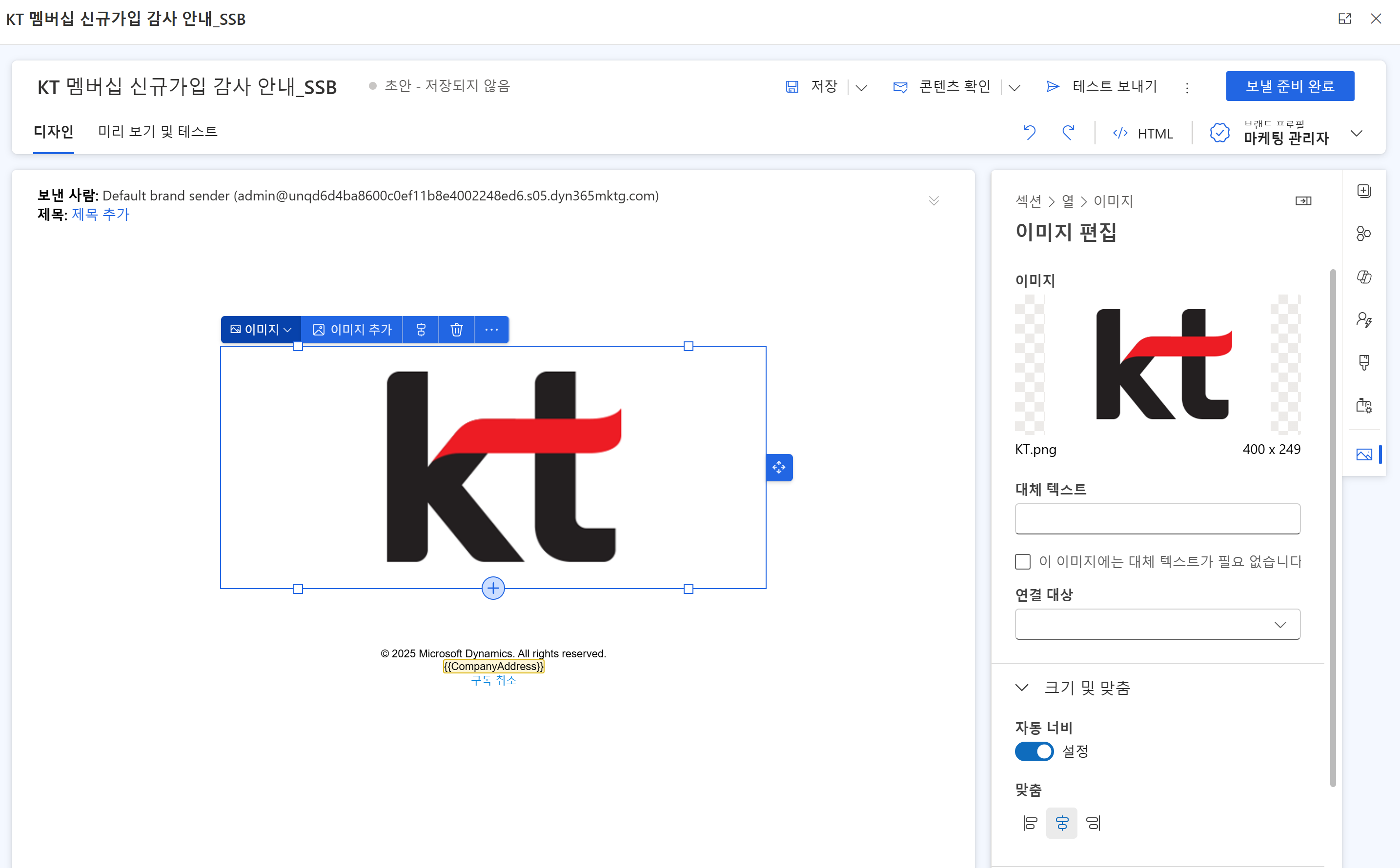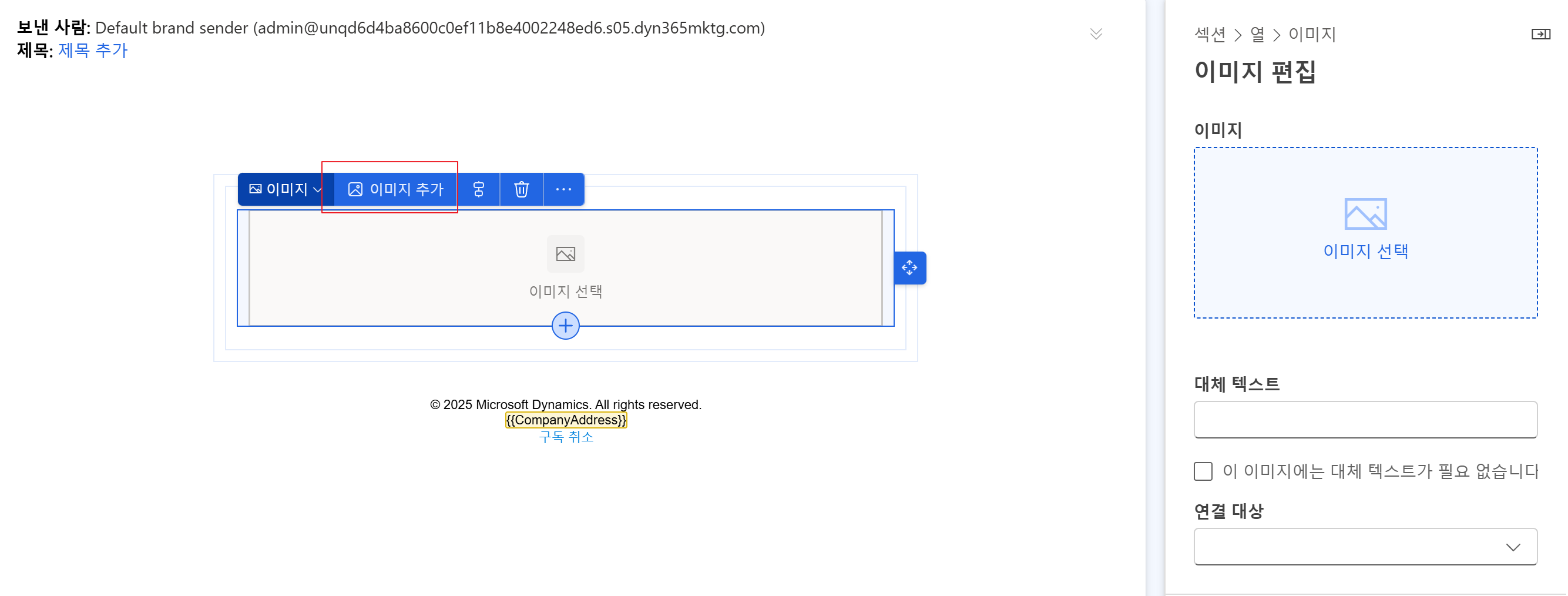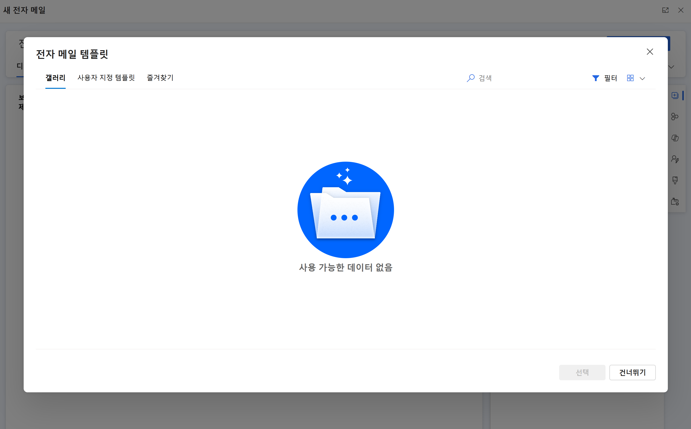 - [+새 전자 메일]을 선택하면 아래와 같이 전자 메일 템플릿 화면 팝업 창이 열립니다.