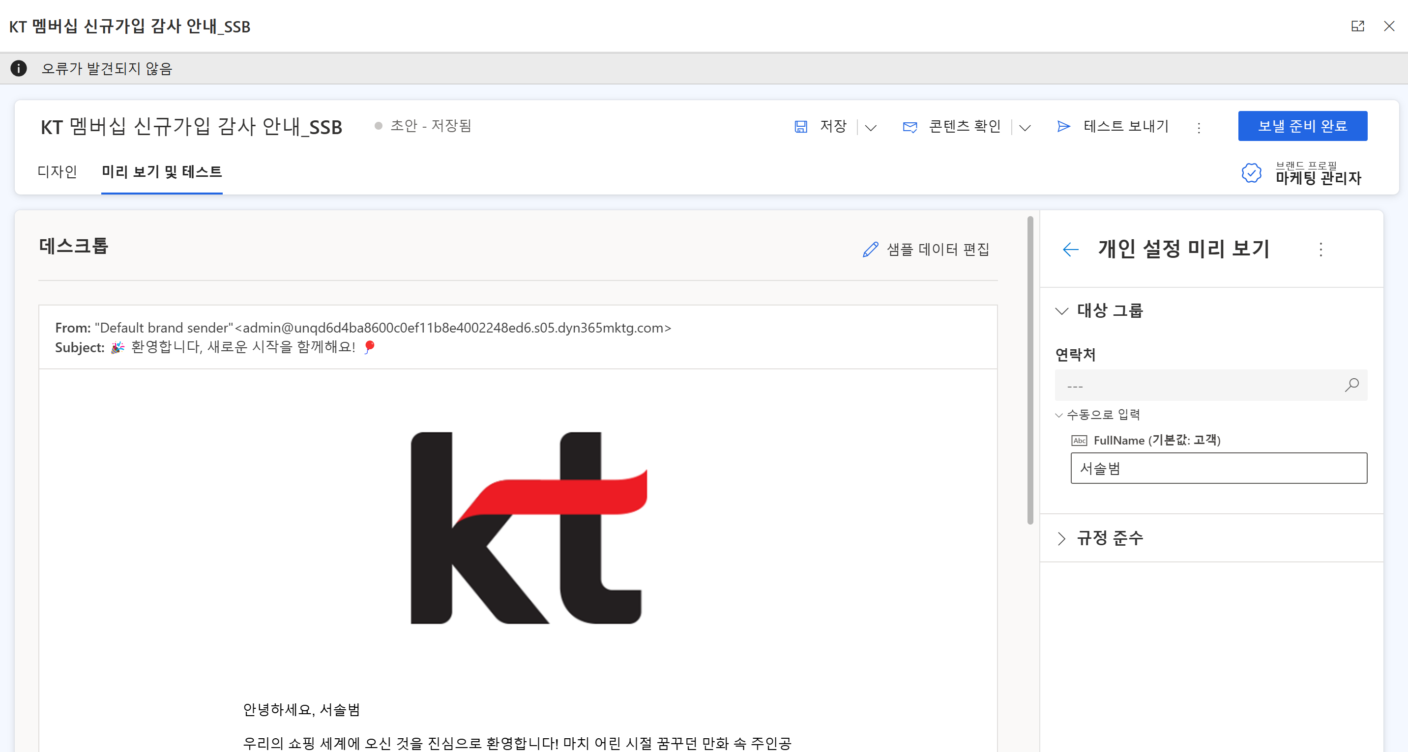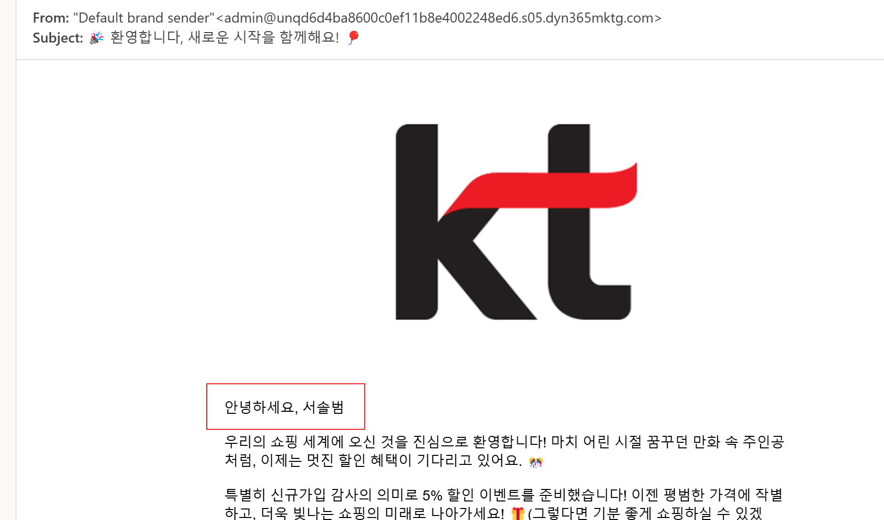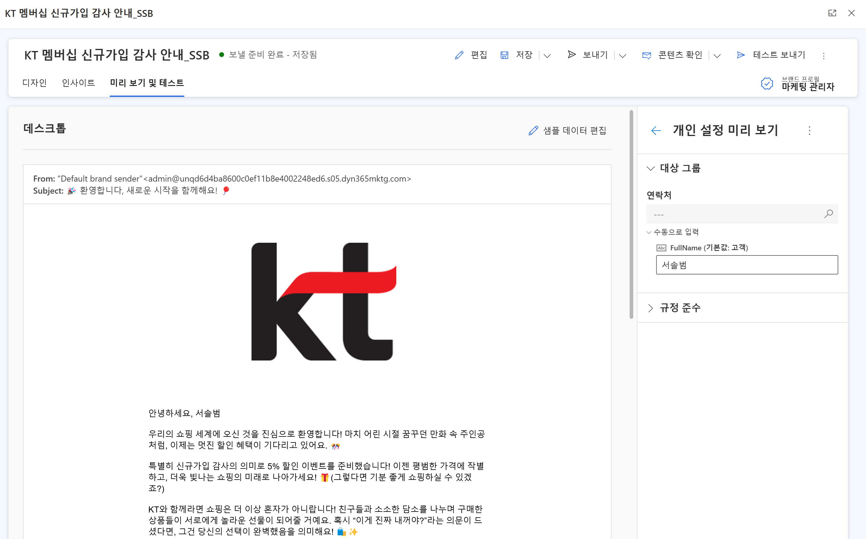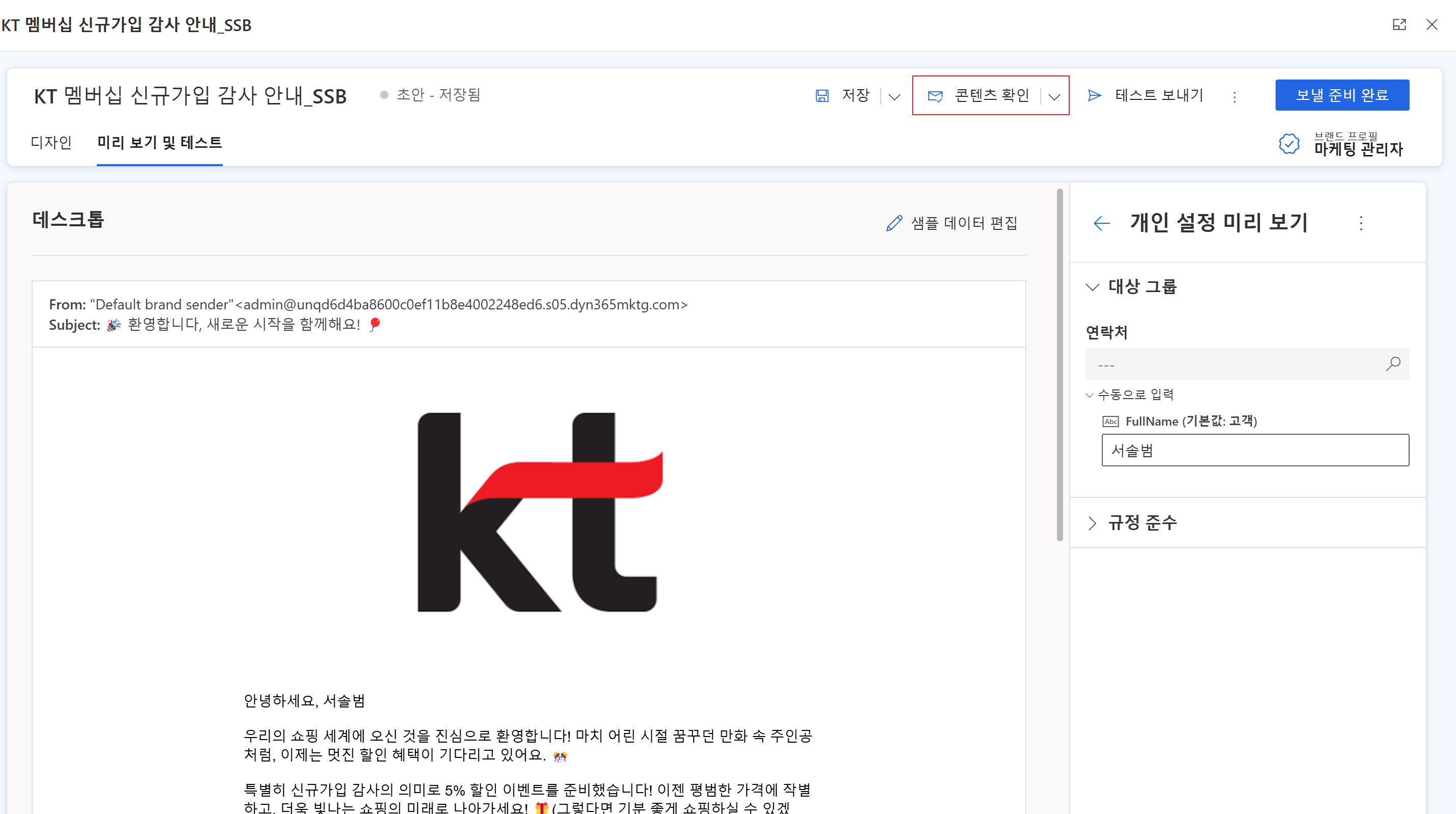 - 콘텐츠에 개인화 변수가 기입한 이름으로 변경됨을 확인할 수 있습니다.