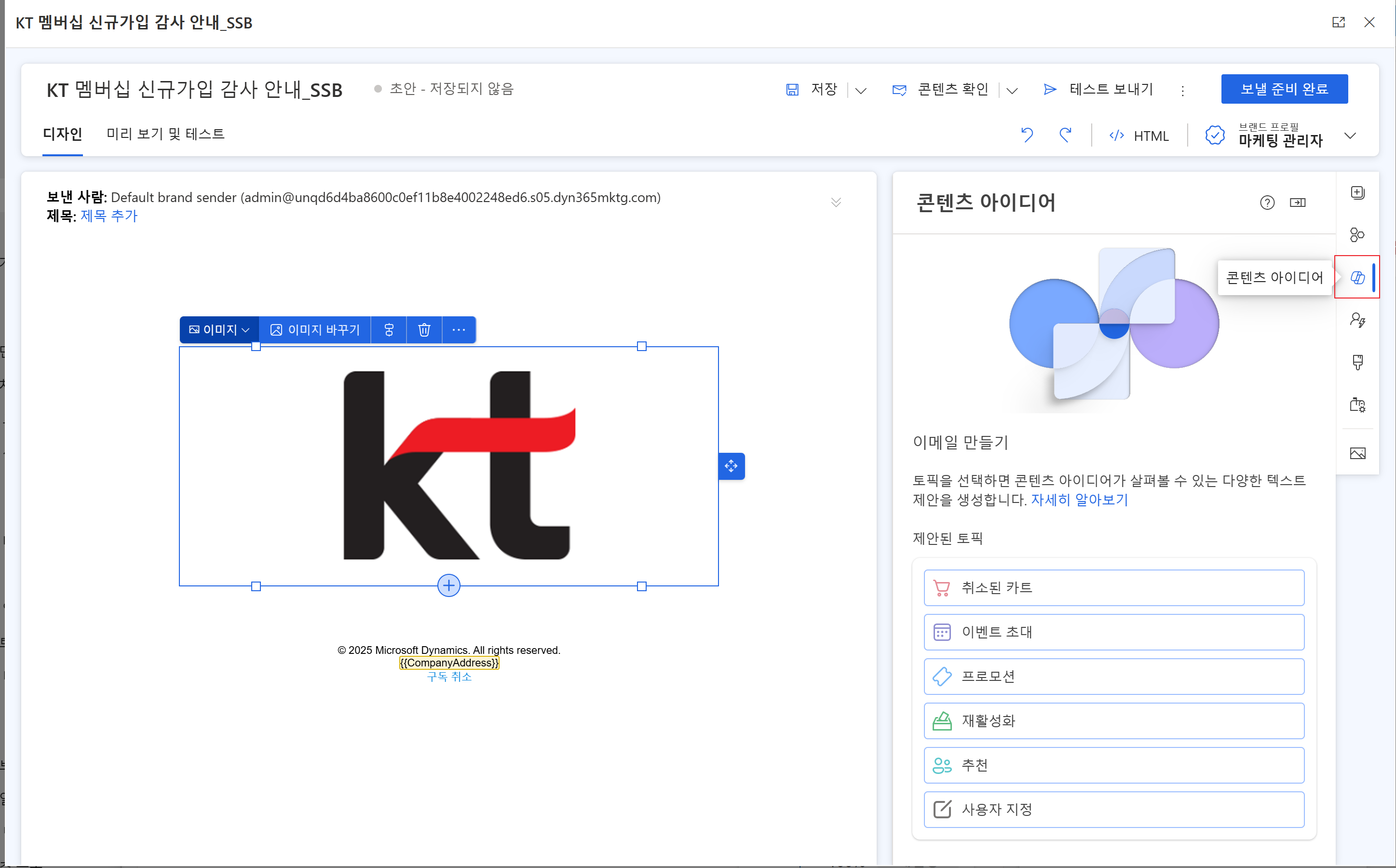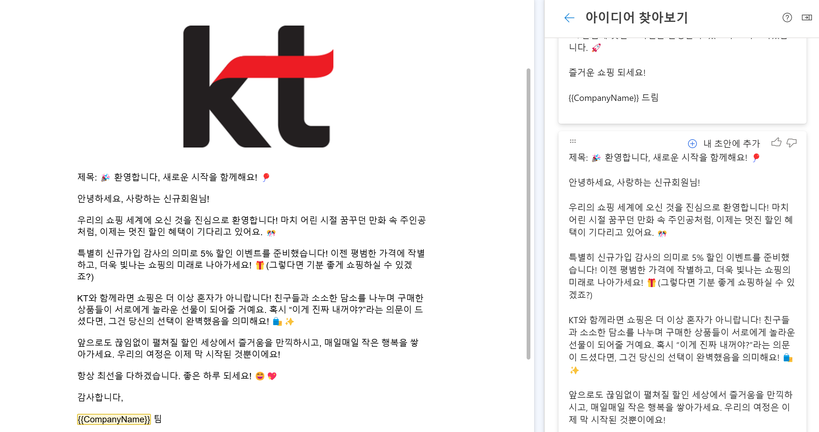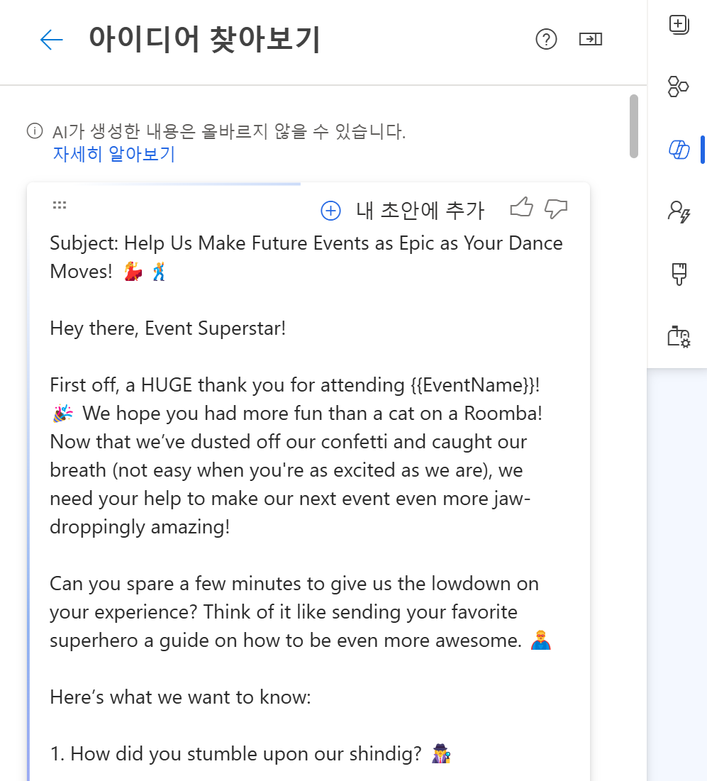 - 다음은 Copilot 기능인 "콘텐츠 아이디어" 메뉴를 통해 콘텐츠 내용을 자동으로 생성해보겠습니다.