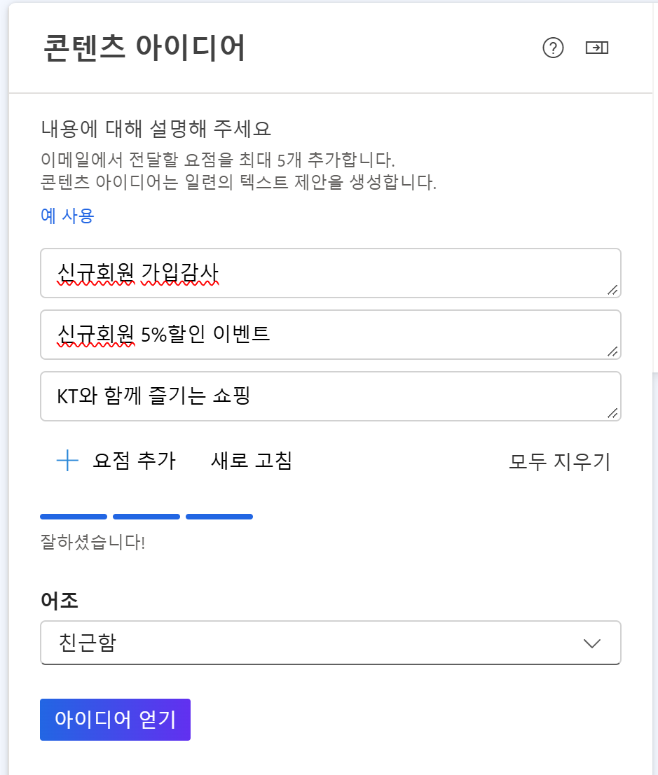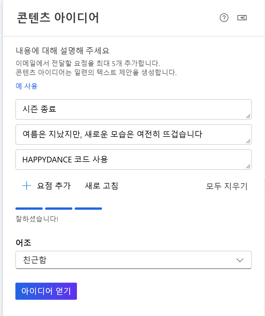 - "친근함"을 선택하고 그대로 [아이디어 얻기]를 클릭합니다.