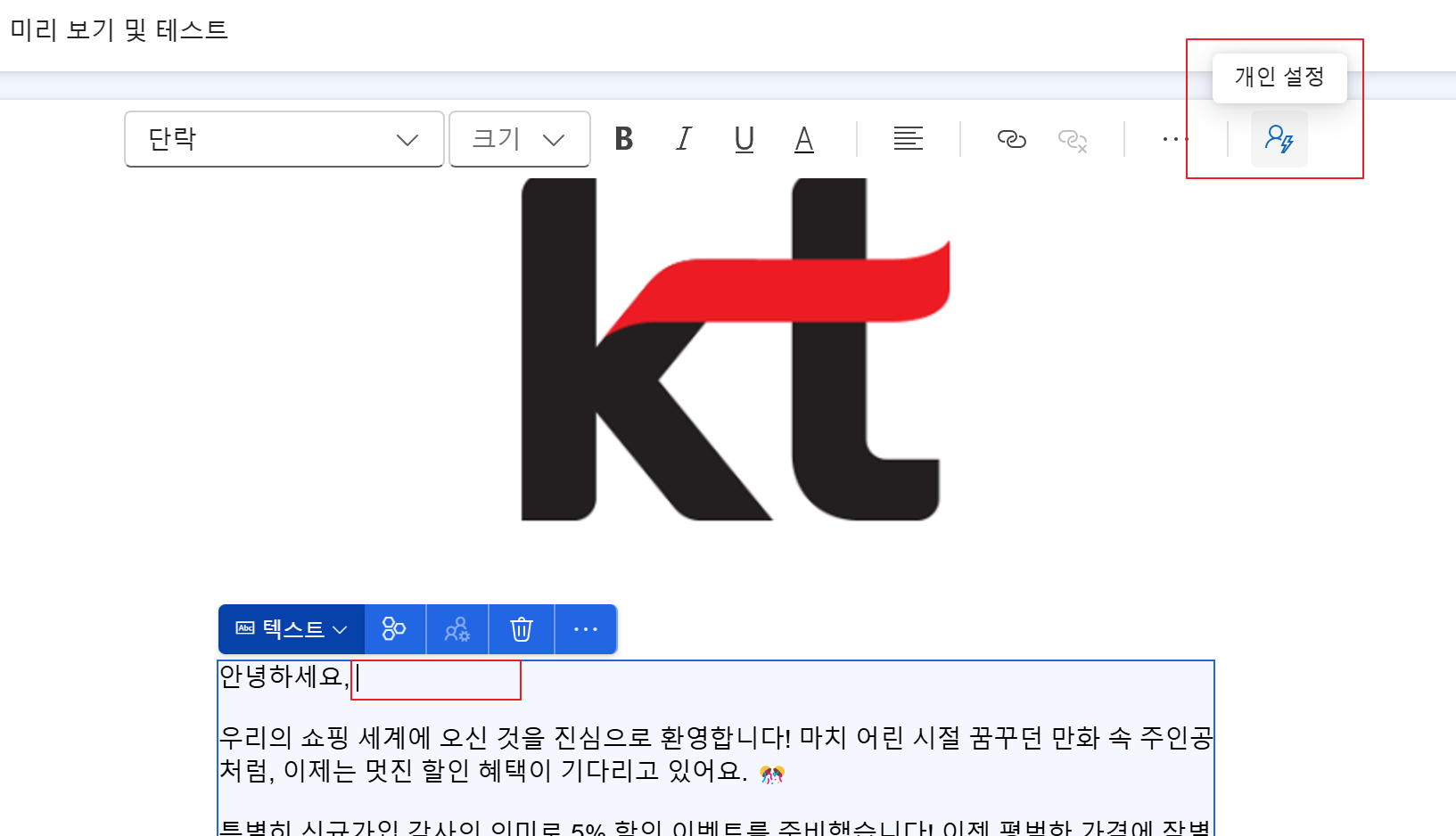 - 마우스 커서를 "안녕하세요. " 뒤에 지정해주고 상단에 [개인 설정] 아이콘을 선택합니다.