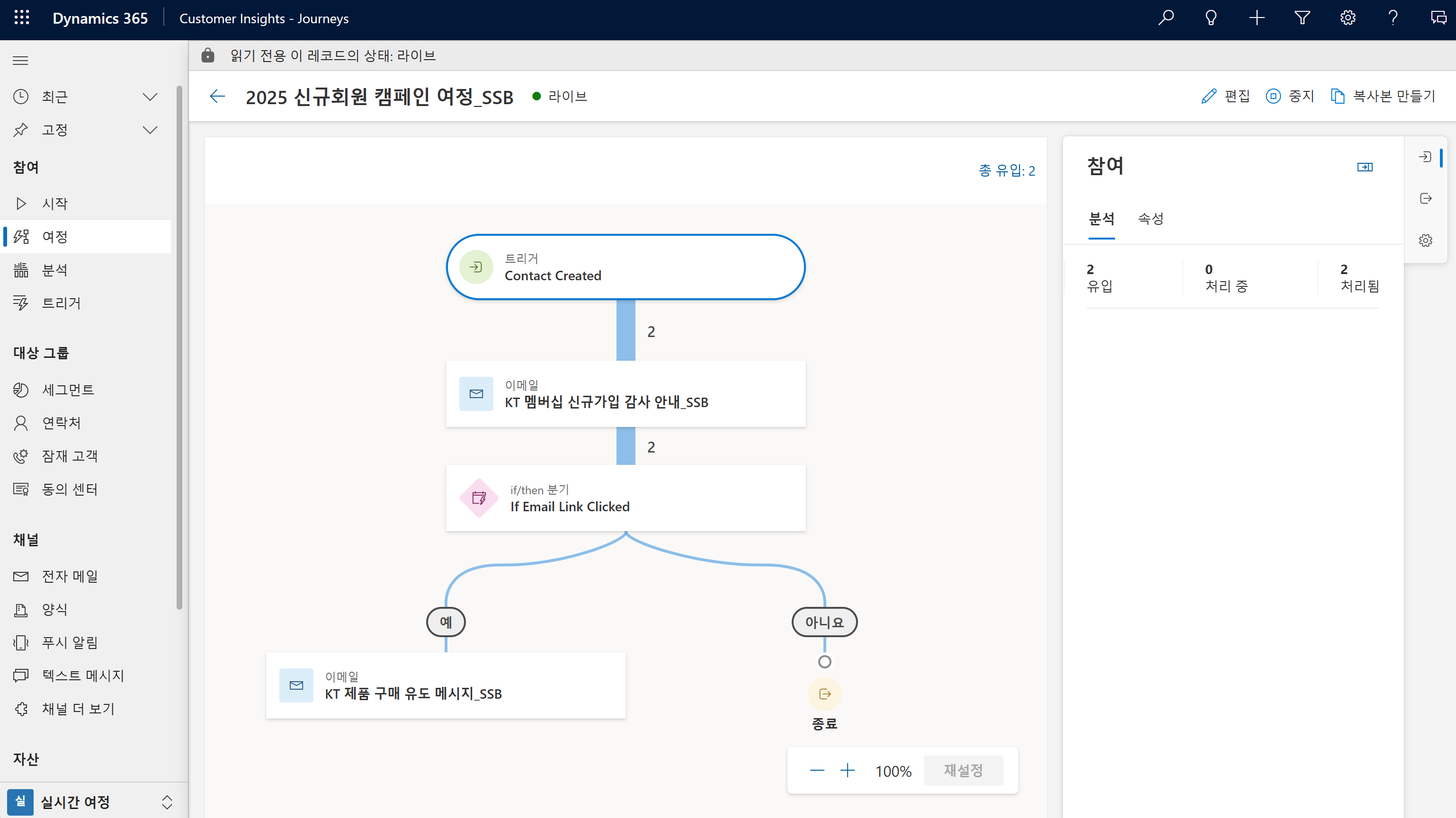 - 링크를 클릭한 이후 캠페인 여정 흐름을 확인해보니 "예" 흐름으로 진행된 것을 확인할 수 있습니다.